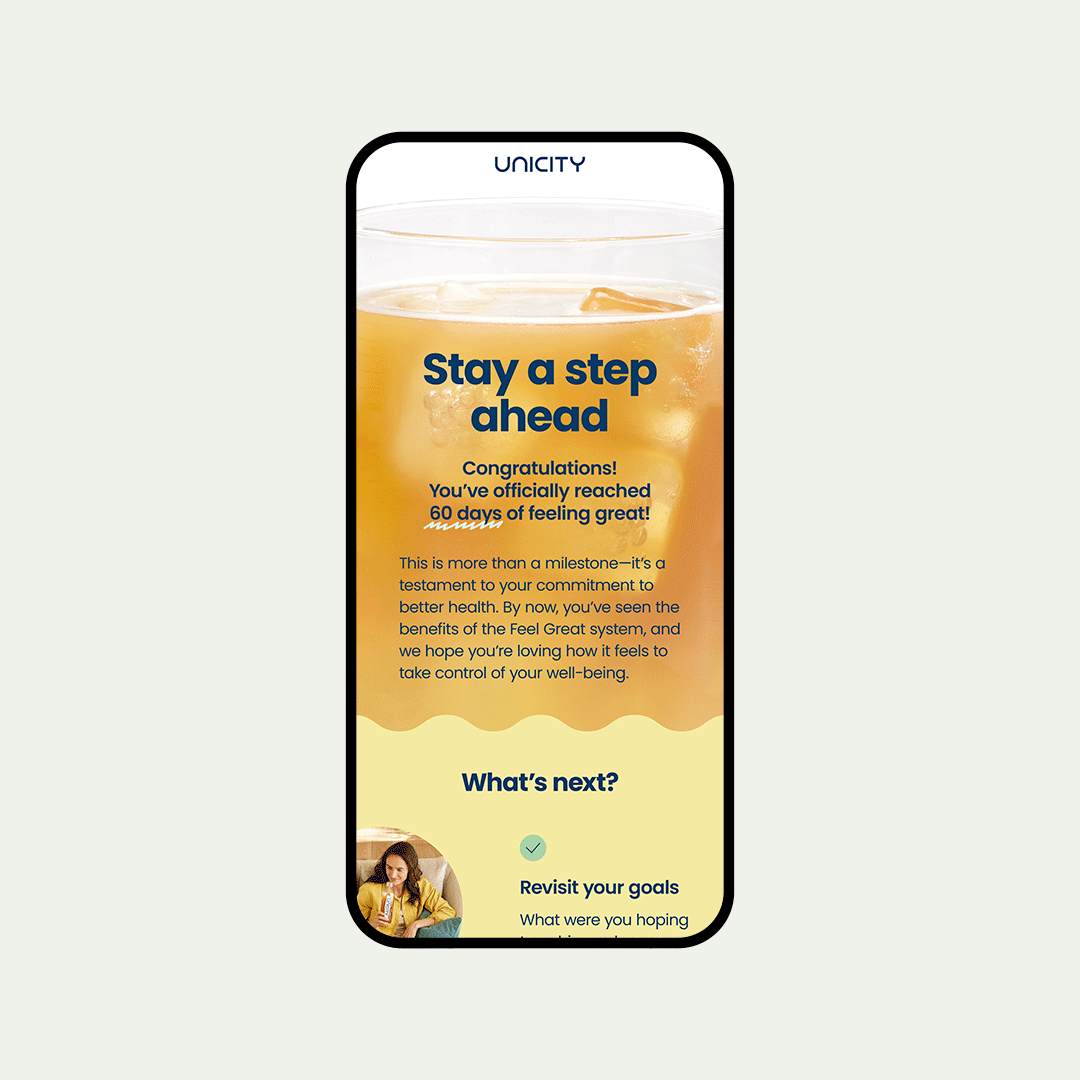 Unicity designs and develops science-backed nutritional products that make healthy living doable in an on-the-go world. For their Feel Great program, I designed the email campaign, developing a style guide and grid system to maintain fresh, consistent designs.